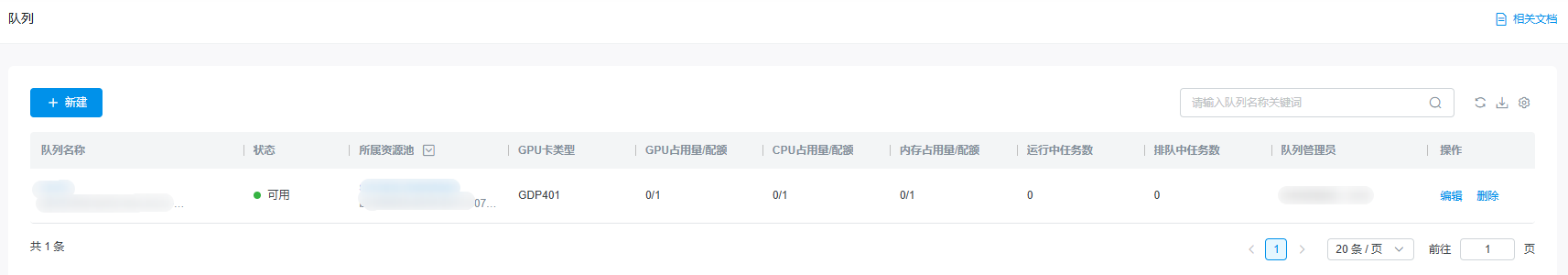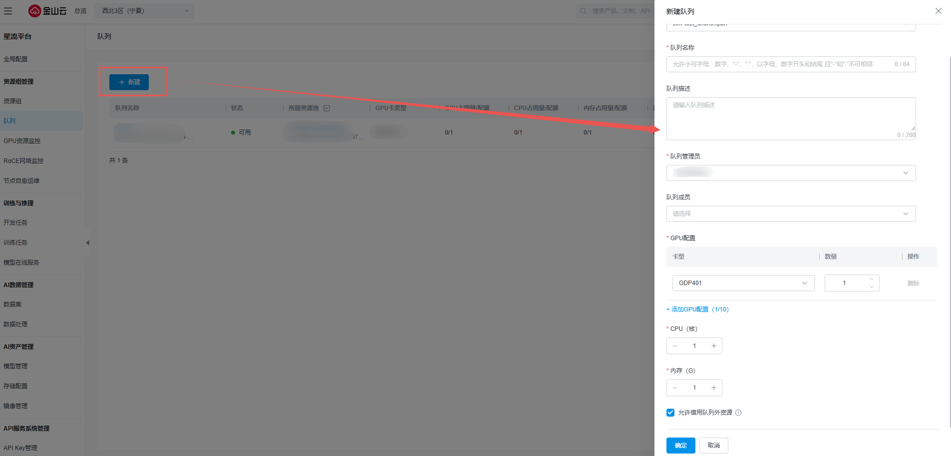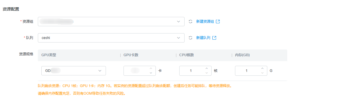 分配GPU资源,用于后续具体任务的创建。点击进入资源池队列管理,新建队列,并配置以下选项。