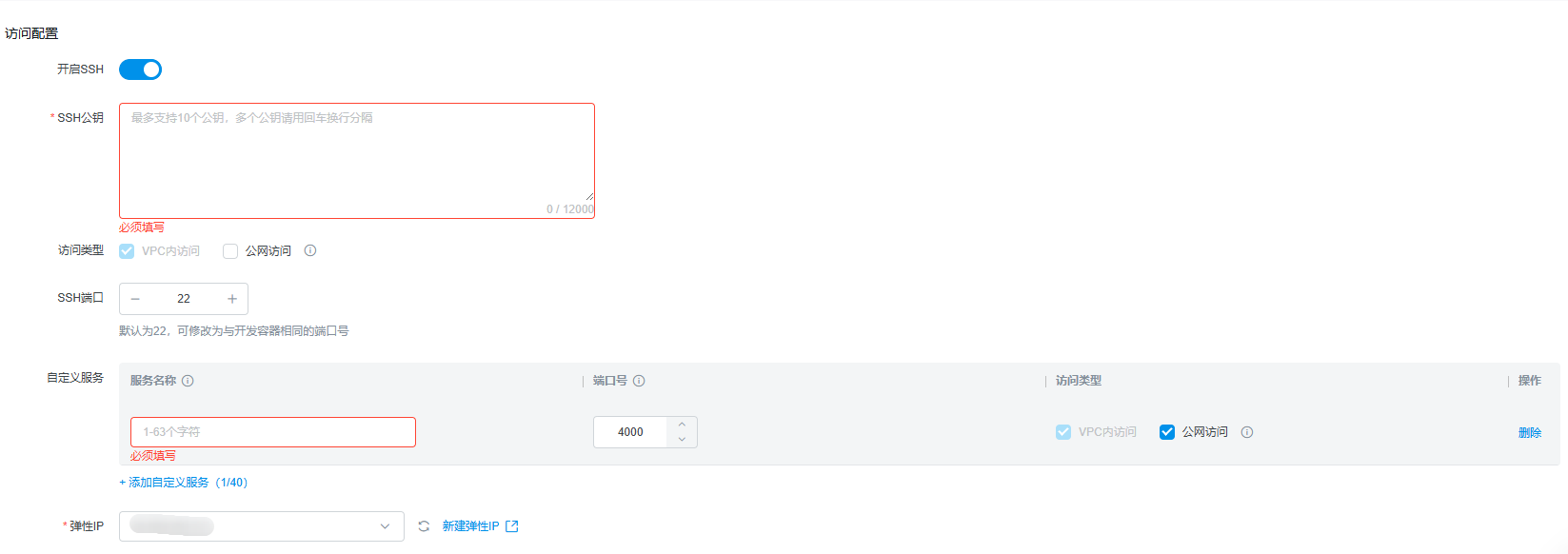1)支持配置SSH访问,开启后需配置SSH公钥,可按需选择。