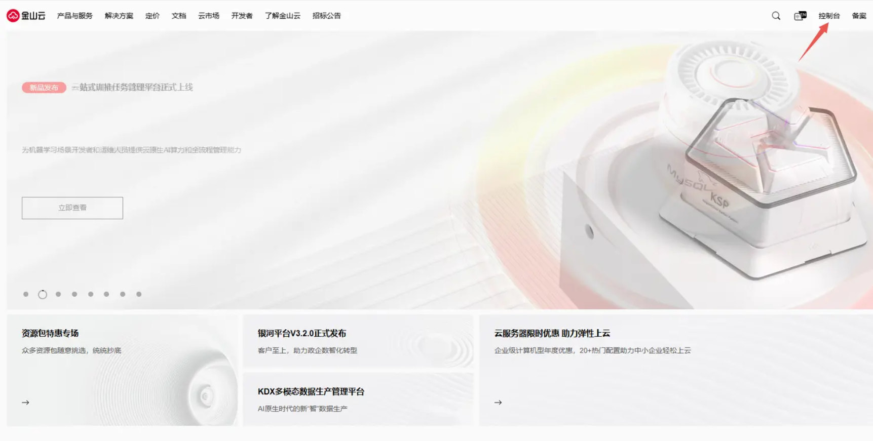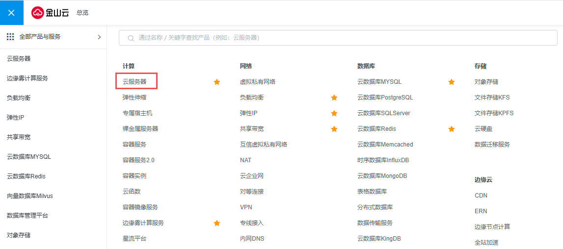 1. 登录金山云平台,切换至控制台界面,选择云服务器