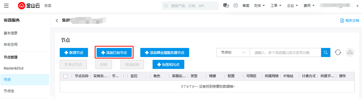 1.容器集群创建完成后,点击集群进入详情配置页面,在左侧导航栏点击节点并选择“+添加已有节点”