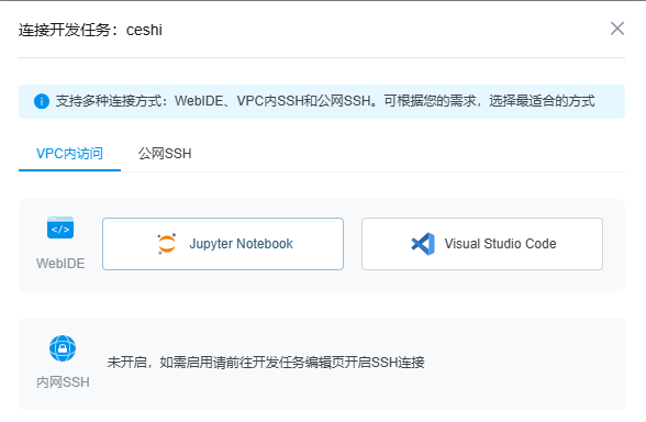 1.任务右侧【连接】中,点击Jupyter后,会弹出新标签页(Web Jupyter),可在该页面对任务进行开发