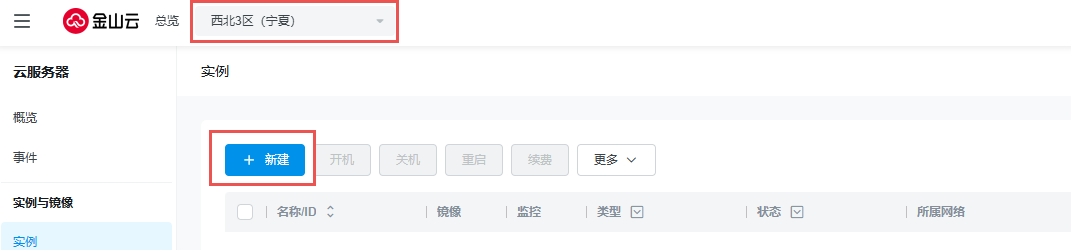 2. 选择区域,点击新建后,选择相应的资源完成云主机创建,并在创建完成后关机;云服务器详细创建流程可参见https://docs.ksyun.com/documents/5338