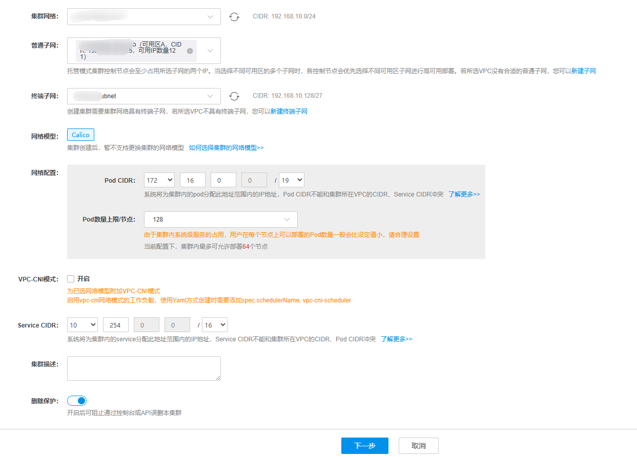 集群网络 | 选择集群所在的VPC网络。当所选Master管理模式为托管模式时,需为托管的控制面节点配置所在子网。控制面节点会至少占用所选子网的三个IP。当选择不同可用区的多个子网时,各控制节点会优先选择不同可用区子网进行高可用部署。 |