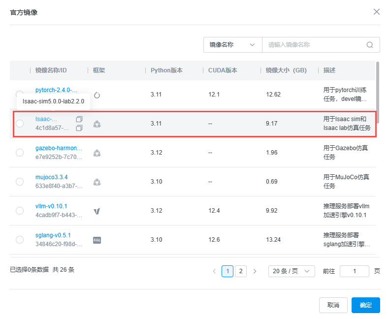 选择仿真容器镜像,如sim5.0版本