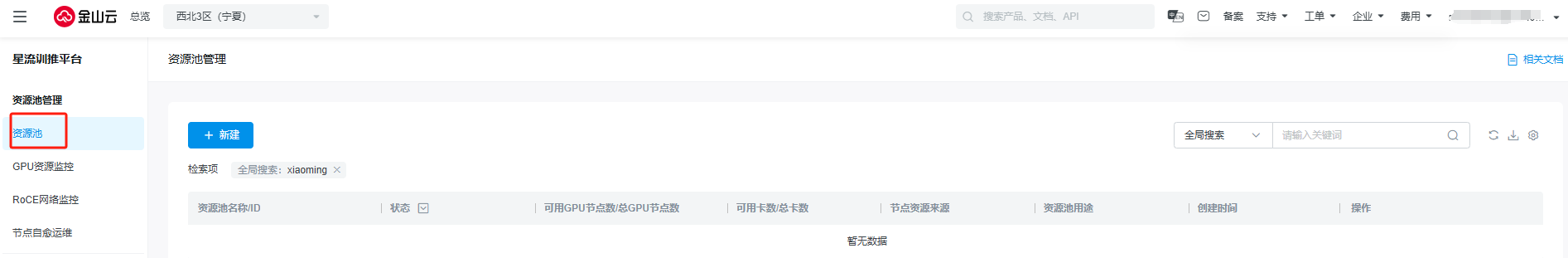 2.新建资源池,点击右侧+新建