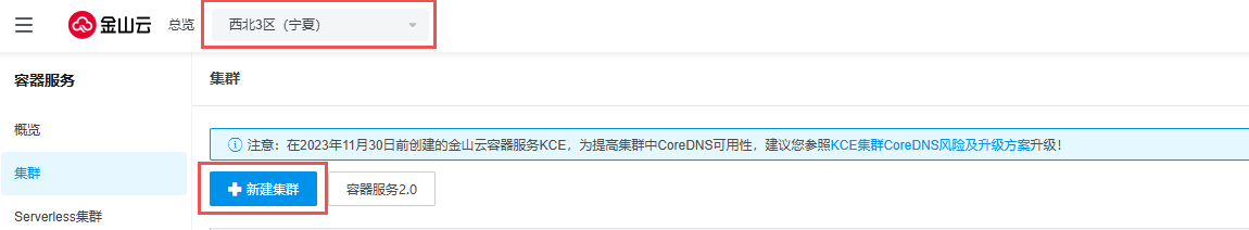 2.选择相应区域后,点击新建集群