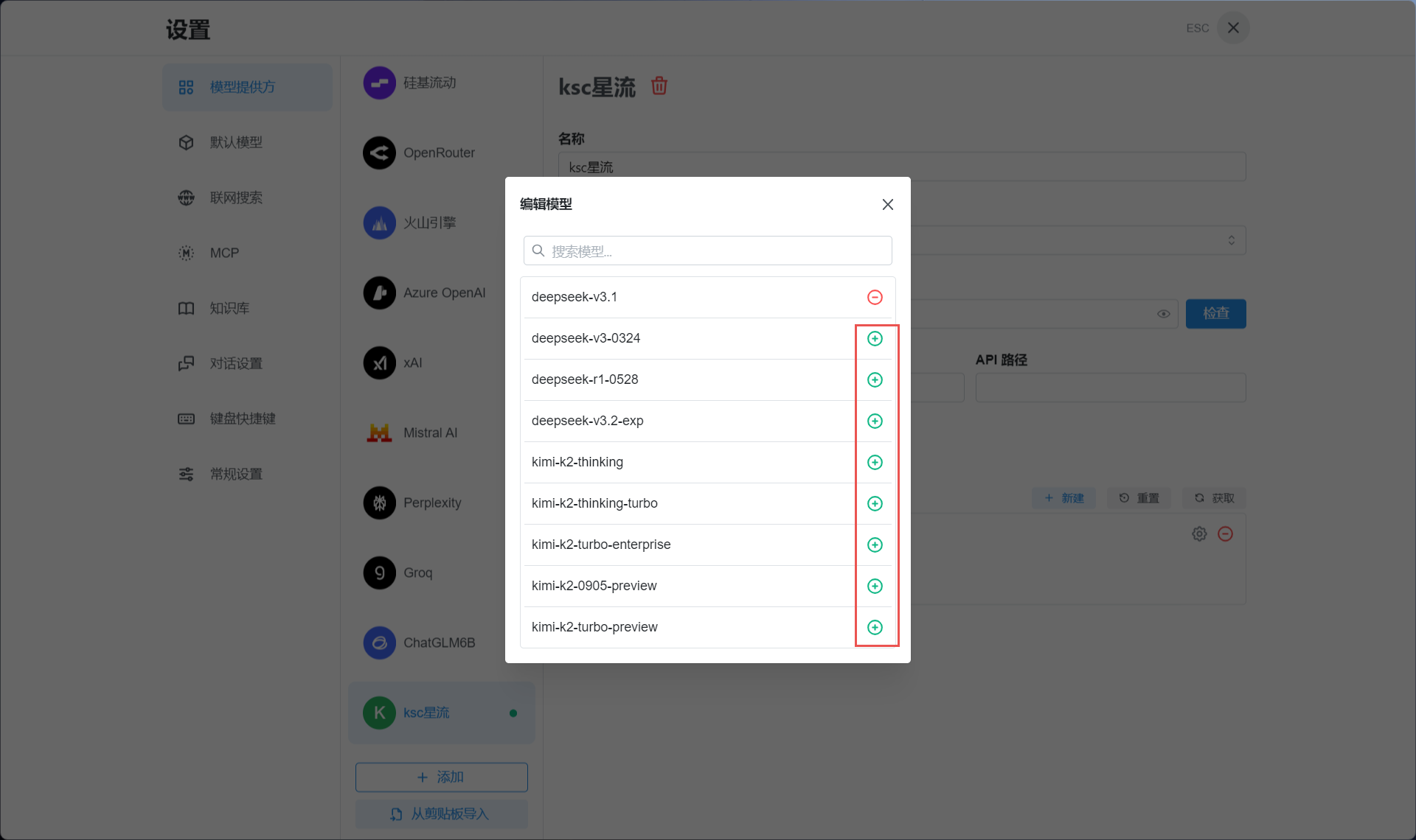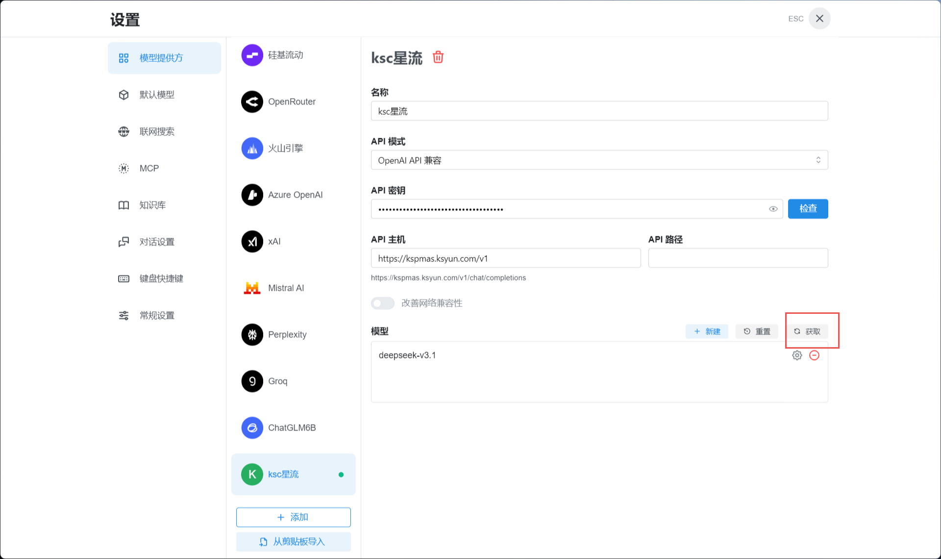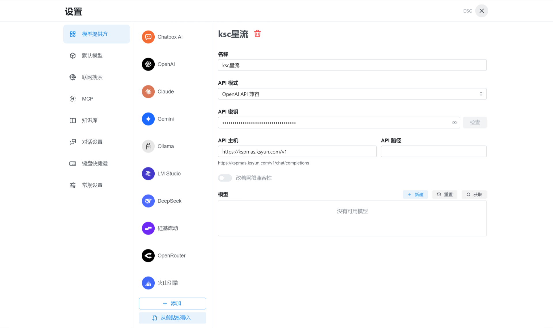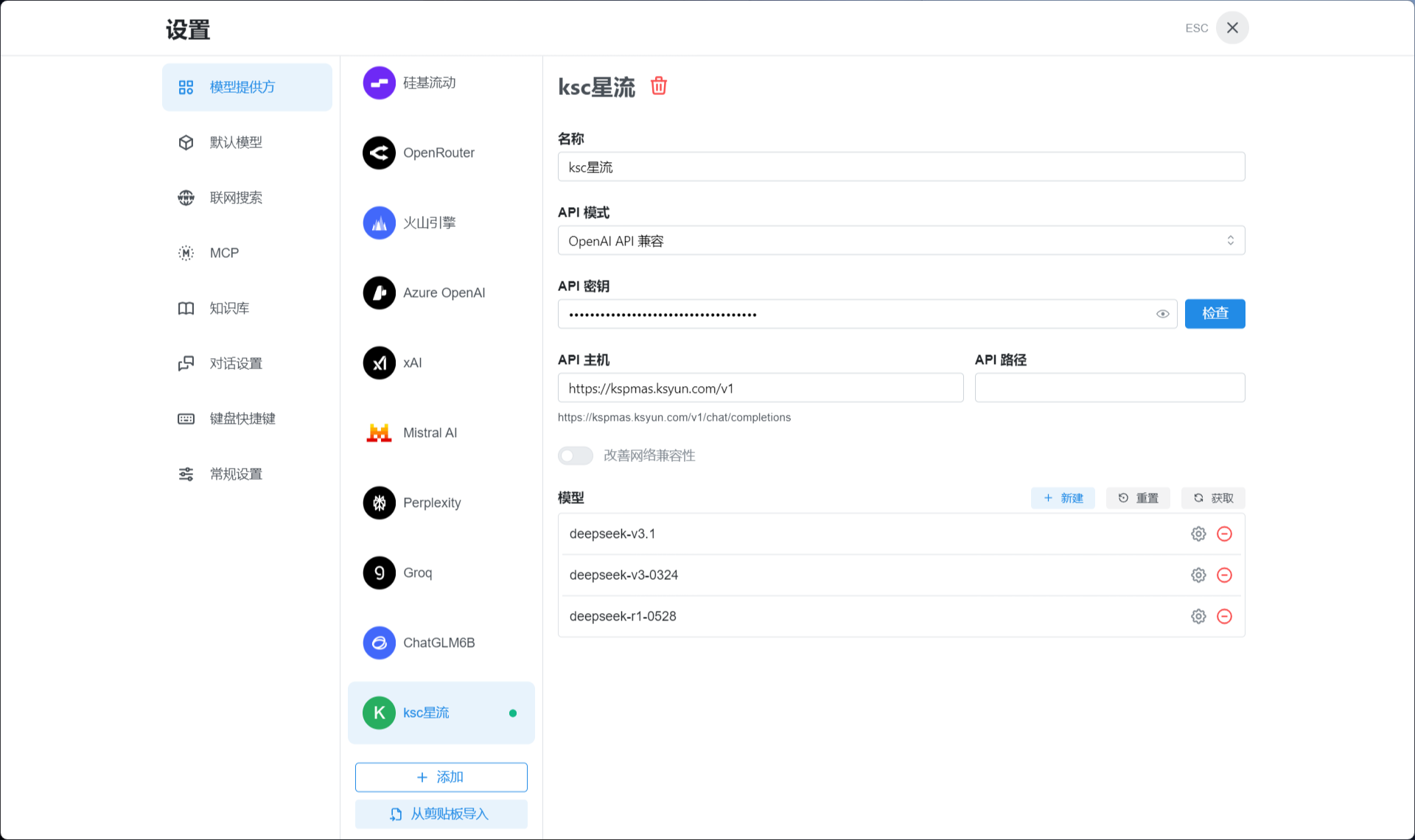 API密钥 | 是 | 请填入您在金山云星流平台创建的API Key,请确保您的Key有您希望使用的大模型之访问权限,并确保您已开通此大模型。API Key获取请查看 模型API服务快速上手 |