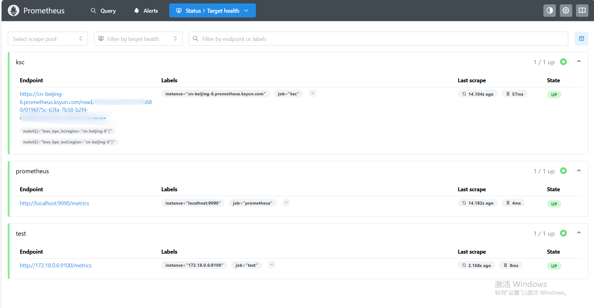//控制台Federate地址公网或内网url域名部分当您完成云上与本地Prometheus实例的接口后访问本地Prometheus实例webui,点击Status即可查看实例接入状态。