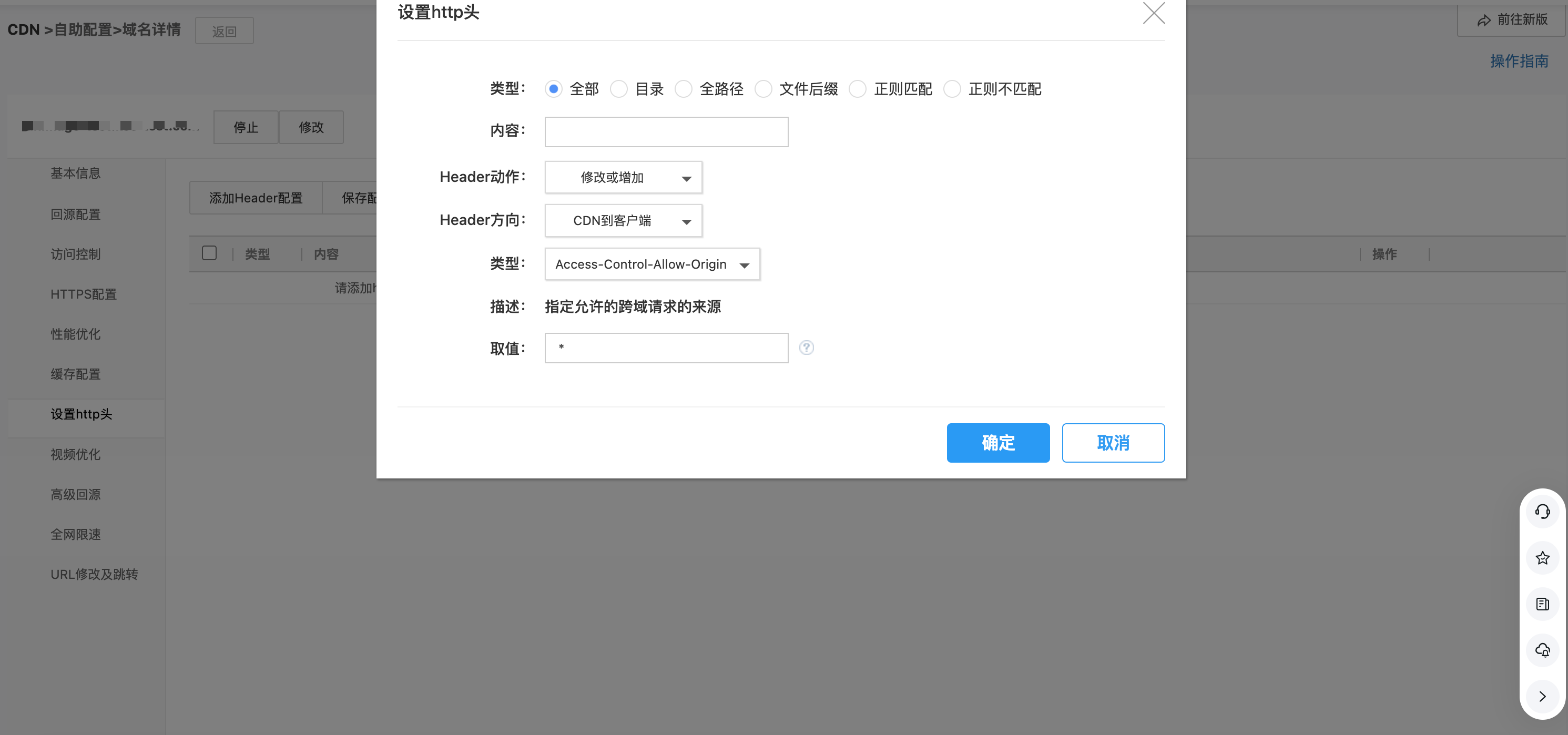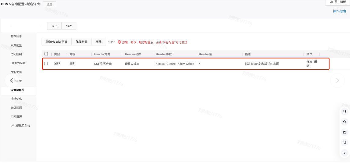 根据浏览器跨域策略,当您加速域名分发的资源需要被其他域引用时,需要在 CDN 配置跨域头,常规情况下在【设置http头】页面添加 CDN对客户端的响应头Access-Control-Allow-Origin: *即可,配置如下