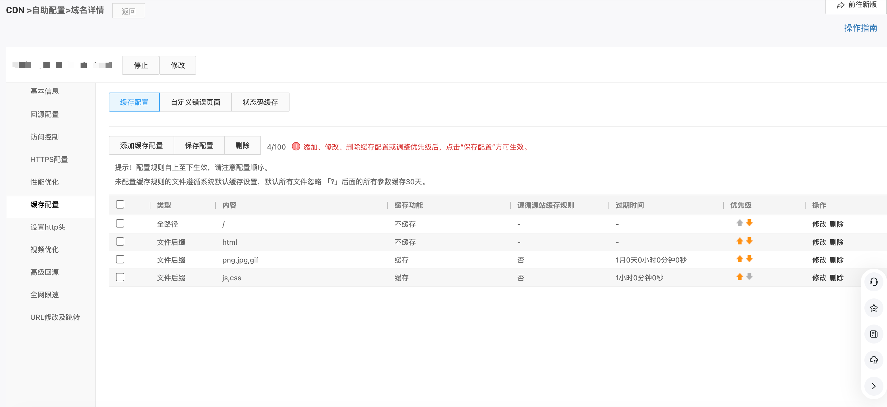 根据您的业务需求,可自行对文件后缀、全路径、目录三个维度配置不同的缓存,注意缓存配置优先级,推荐全路径>目录>文件后缀。