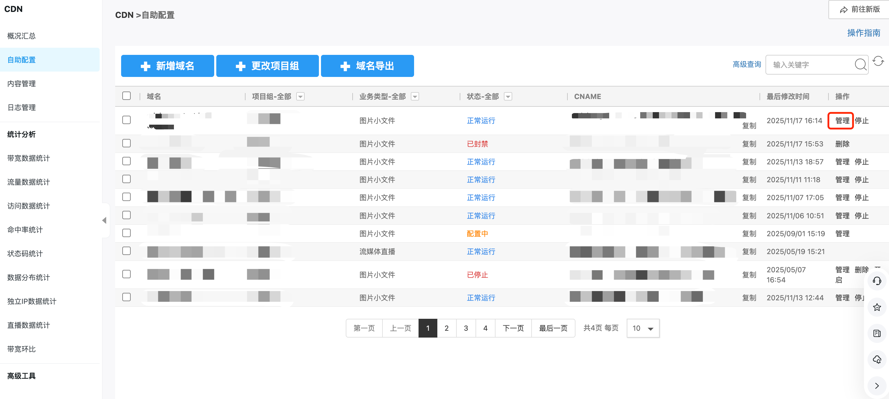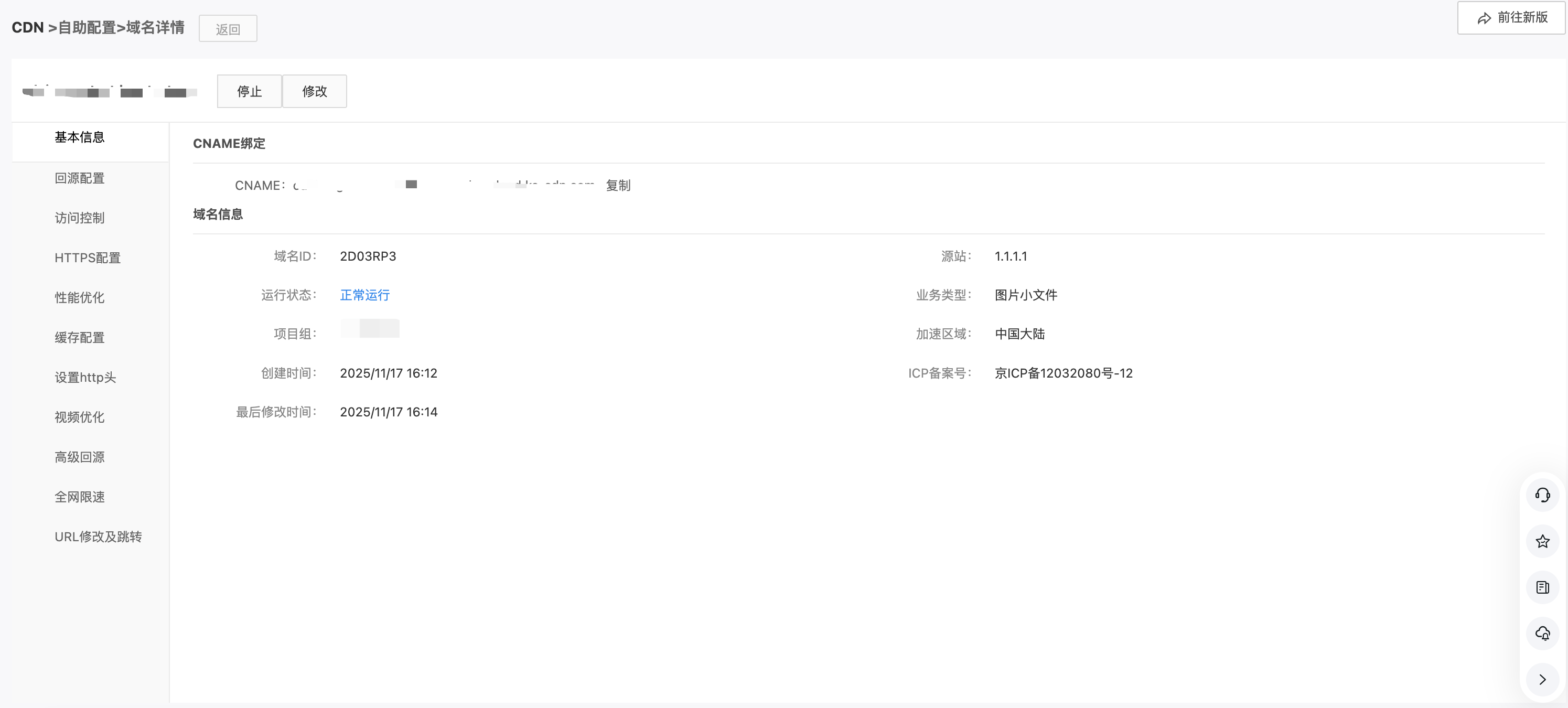 创建域名后等待 1~3分钟后,确认域名运行状态为正常运行,点击【管理】进入域名管理页面。