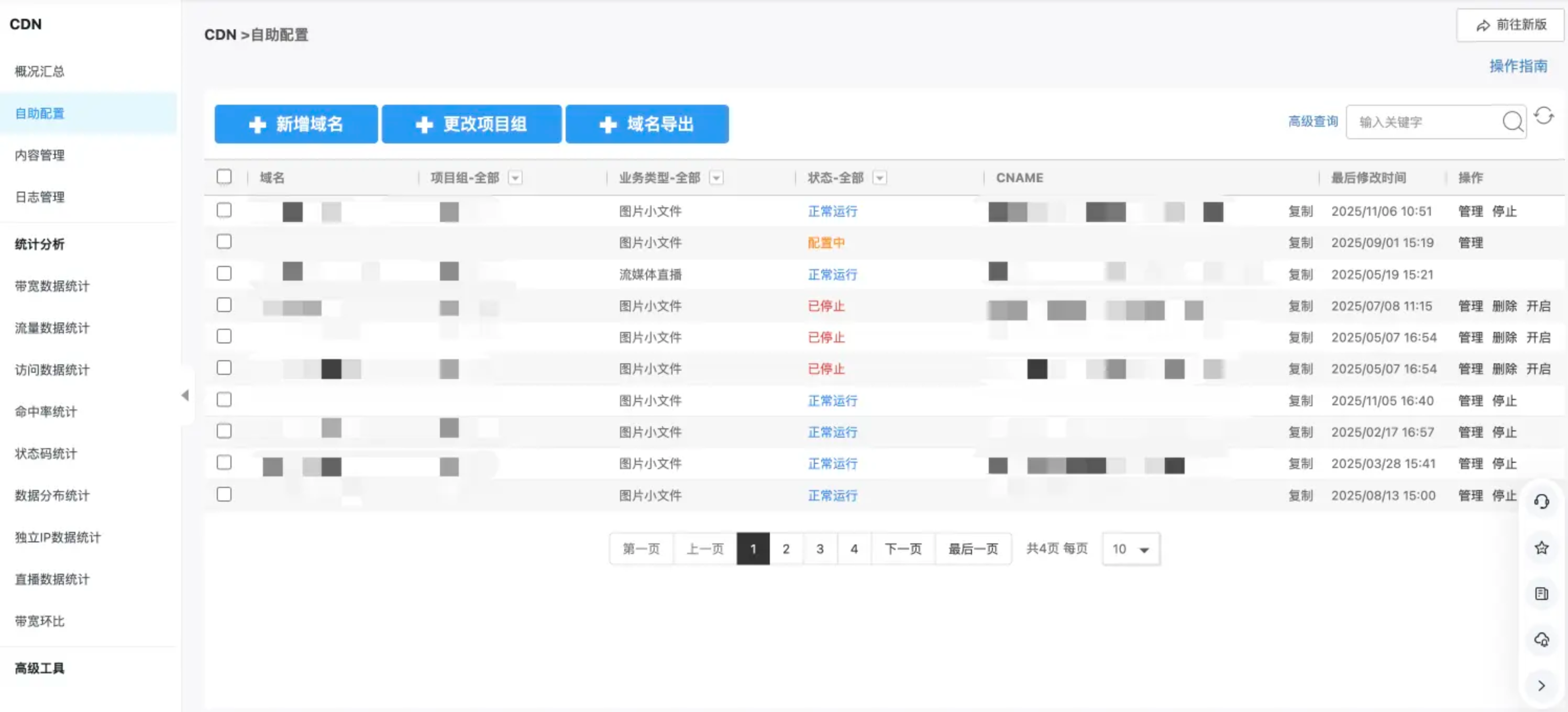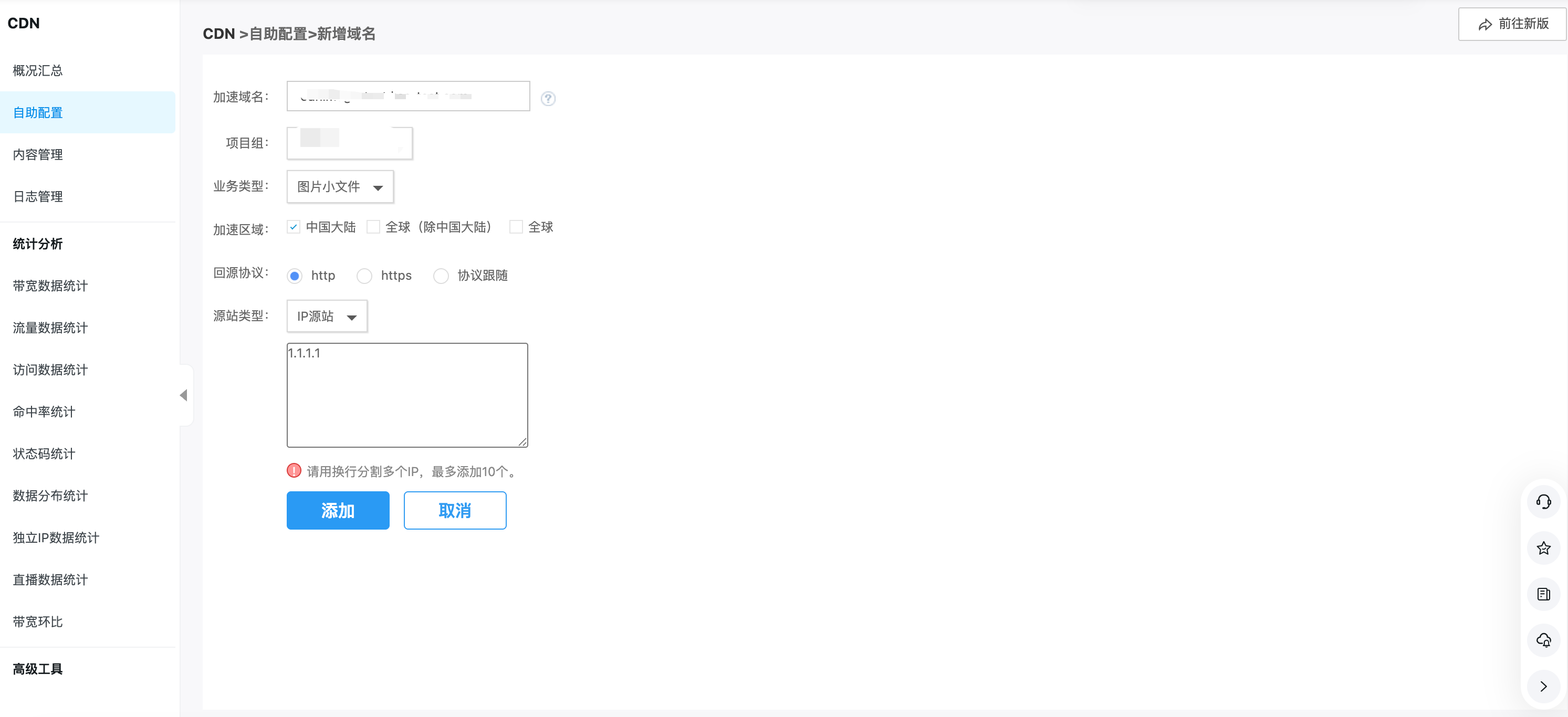 在 CDN控制台【自助配置】页面新增 CDN 域名。