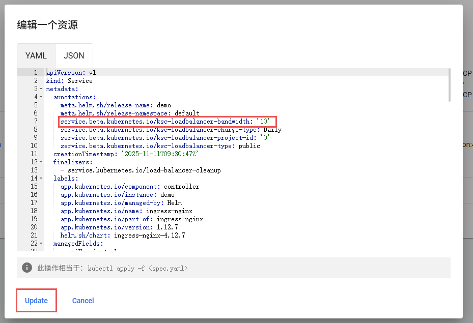 编辑服务(edit service),将 service 的注解(annotations)字段中 service.beta.kubernetes.io/ksc-loadbalancer-bandwidth 的值修改为预期带宽,然后Update,带宽配置修改完成。