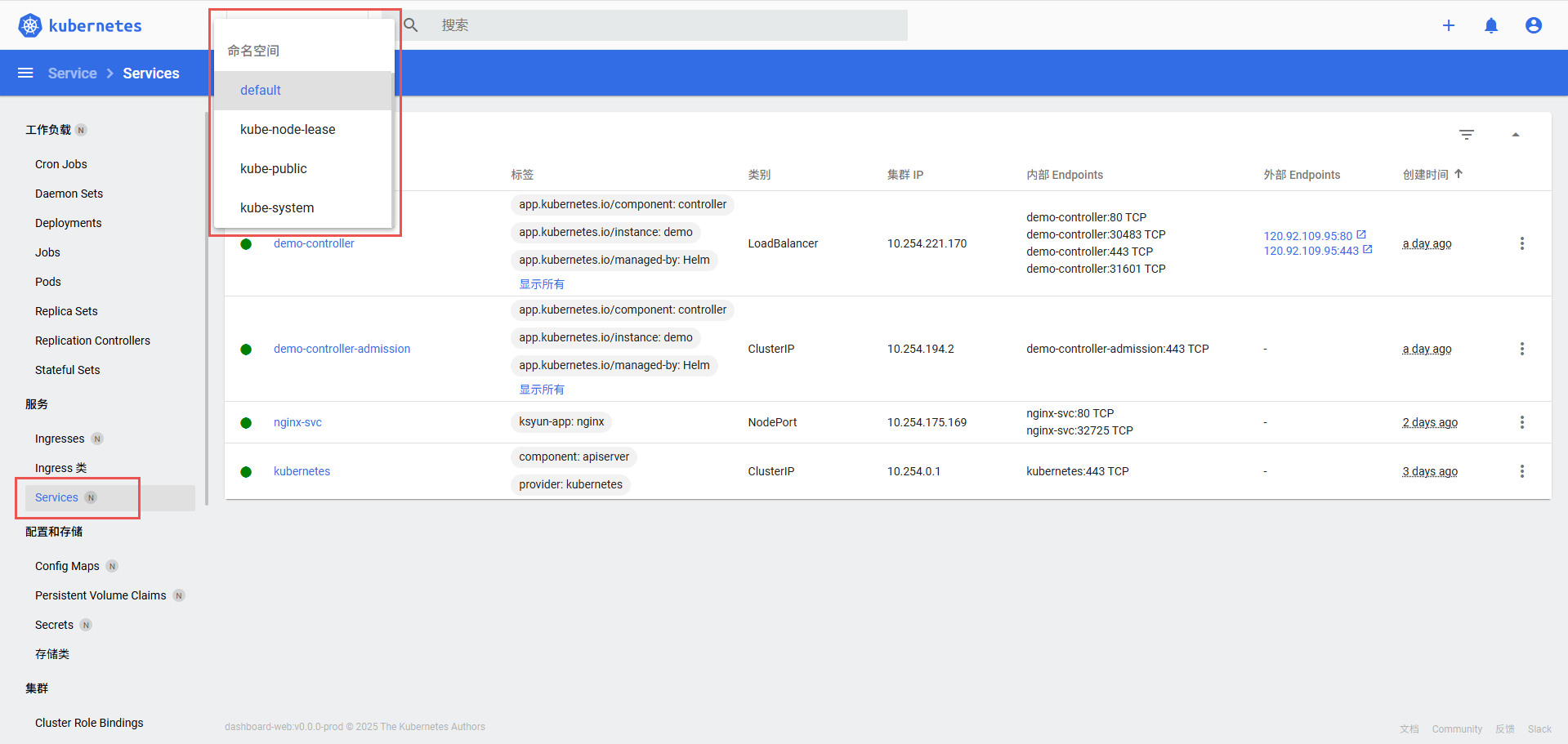 在集群管理页面选择K8sDashboard,进入Kubernetes 仪表板页面。在Services目录页面中,查找需要修改的ingress-nginx实例对应的service,该service名称为 <ingress-nginx实例名称>-controller,命名空间与ingress-nginx实例一致。