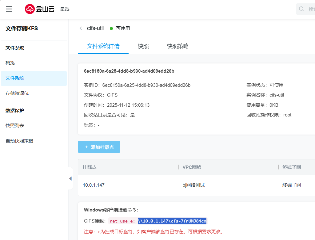 yum install cifs-utils进入文件存储KFS控制台,点击“文件系统”,获取对应的KFS实例挂载点
