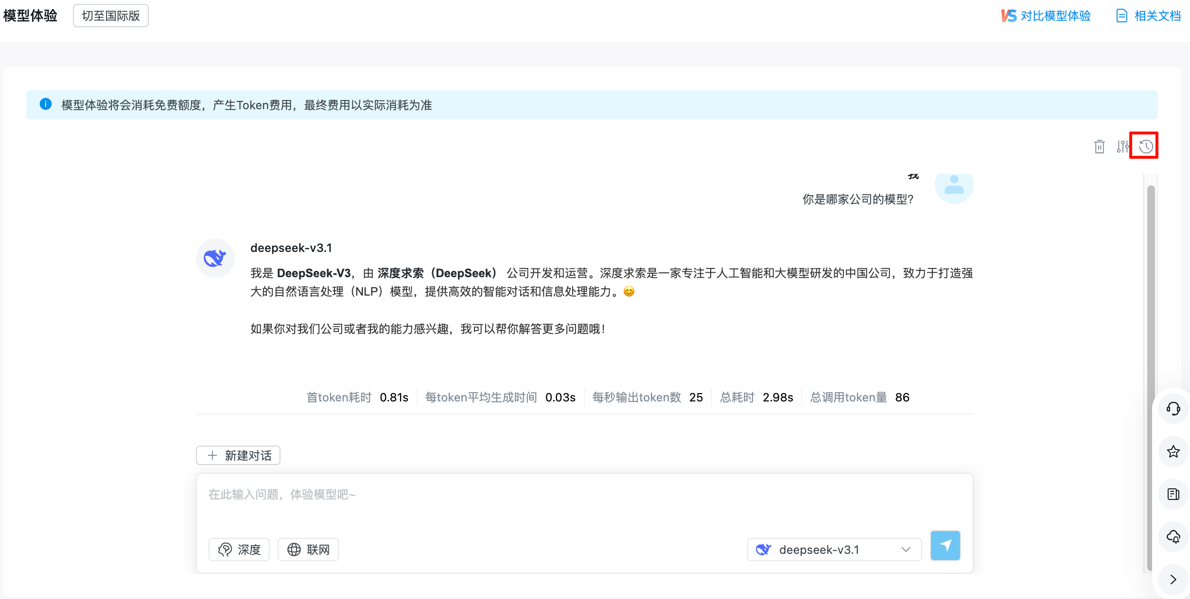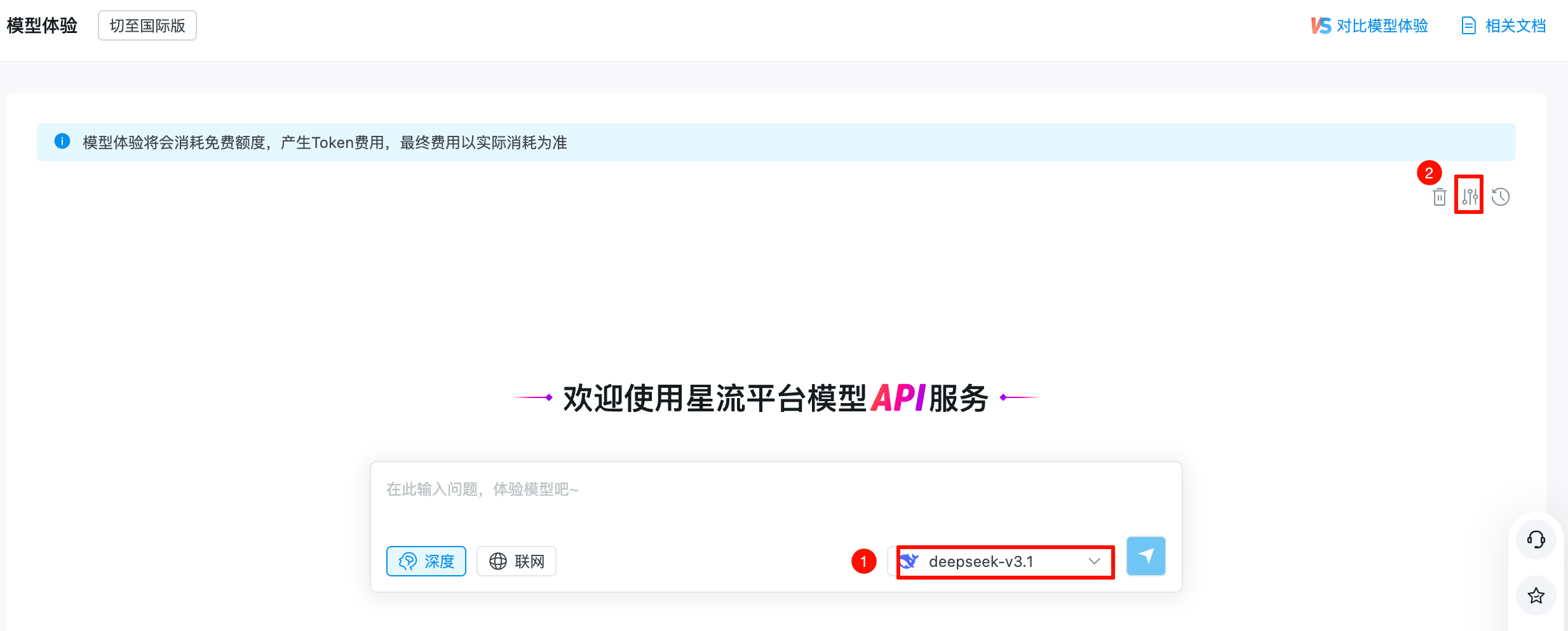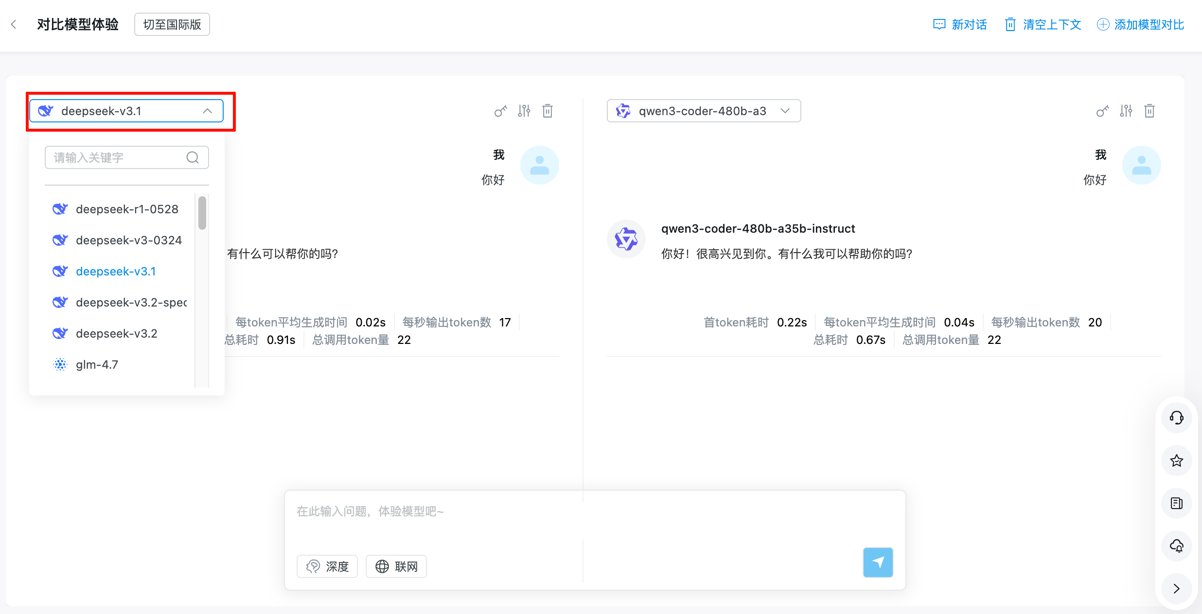 模型体验为您提供一站式的模型交互测试环境,支持用户快速接入并体验模型广场上已有的各个文本类模型。支持用户灵活配置生成参数、并在多轮对话中按需开启深度思考和联网搜索。另外,支持最多同时与 3 个模型对话进行对比体验,并提供上下文管理与历史记录功能。
