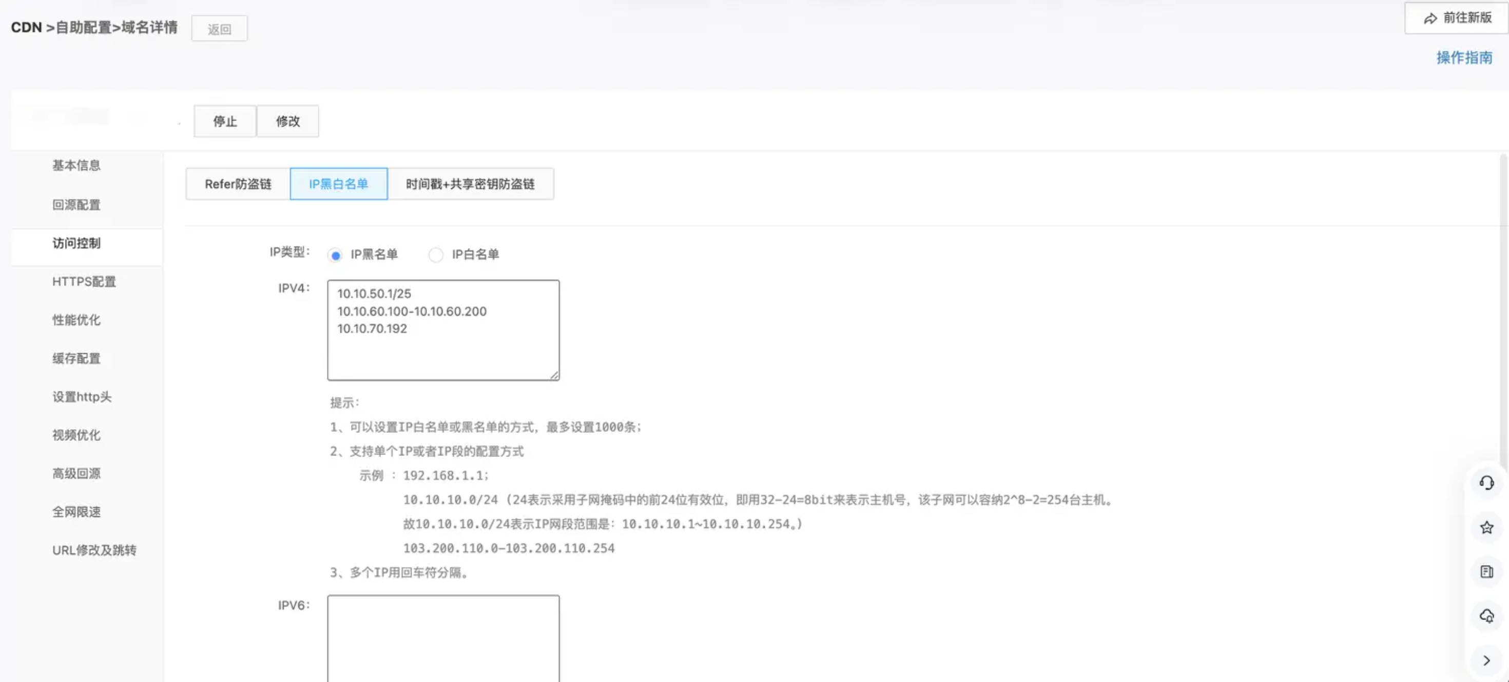 当您的业务为全网分发场景,但存在部分IP或IP段异常集中访问时,可以考虑采用IP黑名单配置。
