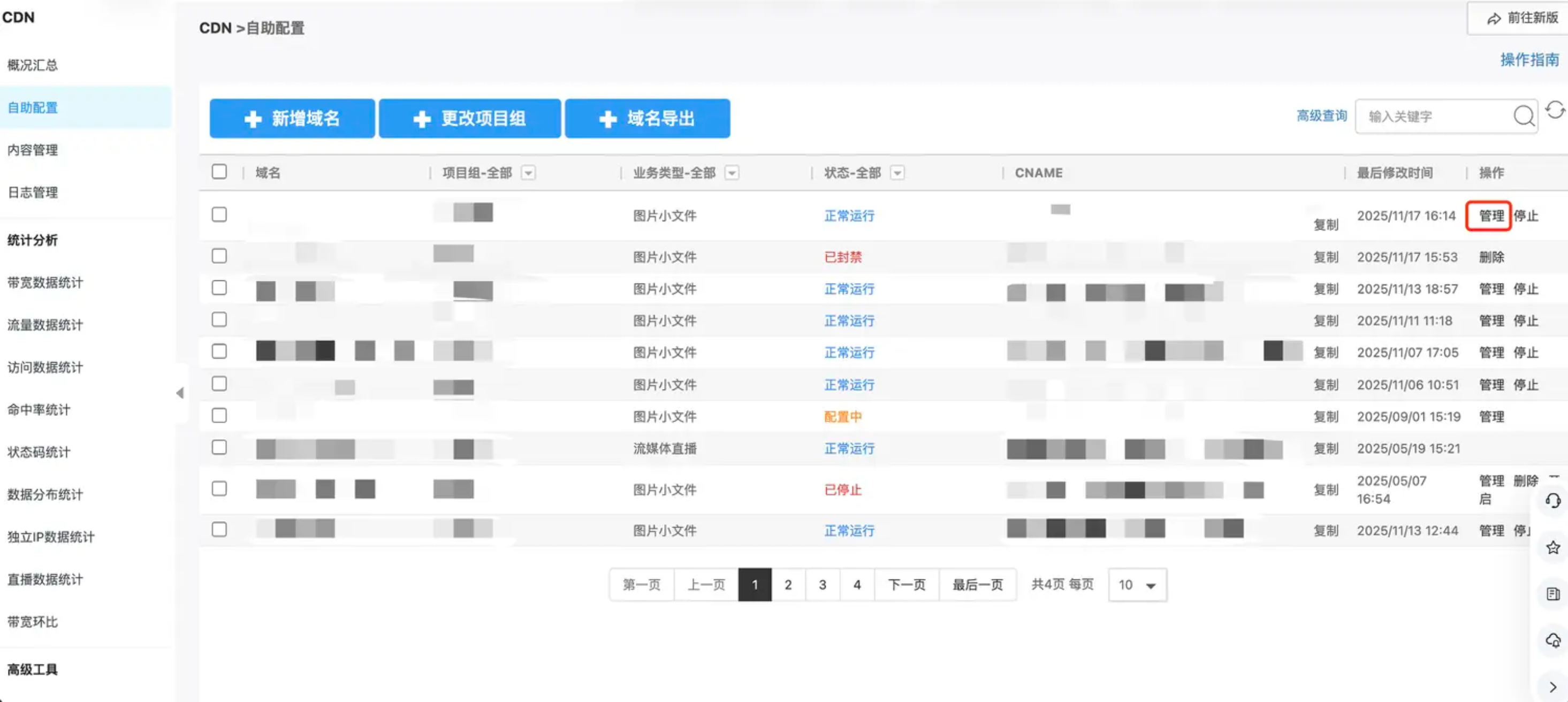 1.进入CDN控制台【自助配置】页面,找到指定域名,点击【管理】进入域名配置页面。