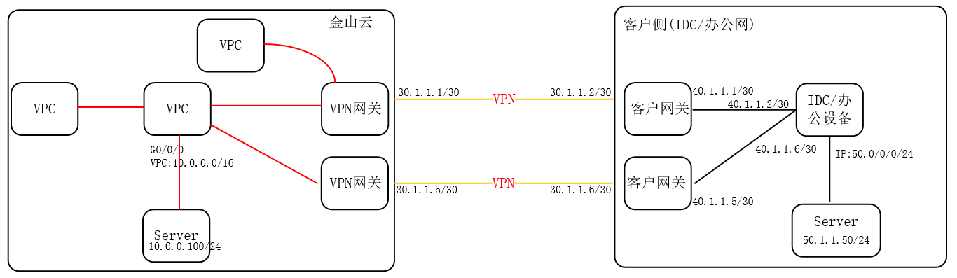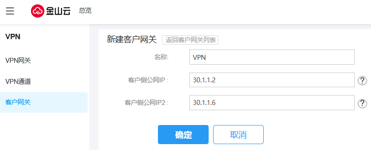 用户网关:用户网关是指用户IDC机房的IPsecVPN服务网关,用户网关需与金山云VPN网关配合使用,一个VPN网关可与多个用户网关建立加密的VPN网络通道。