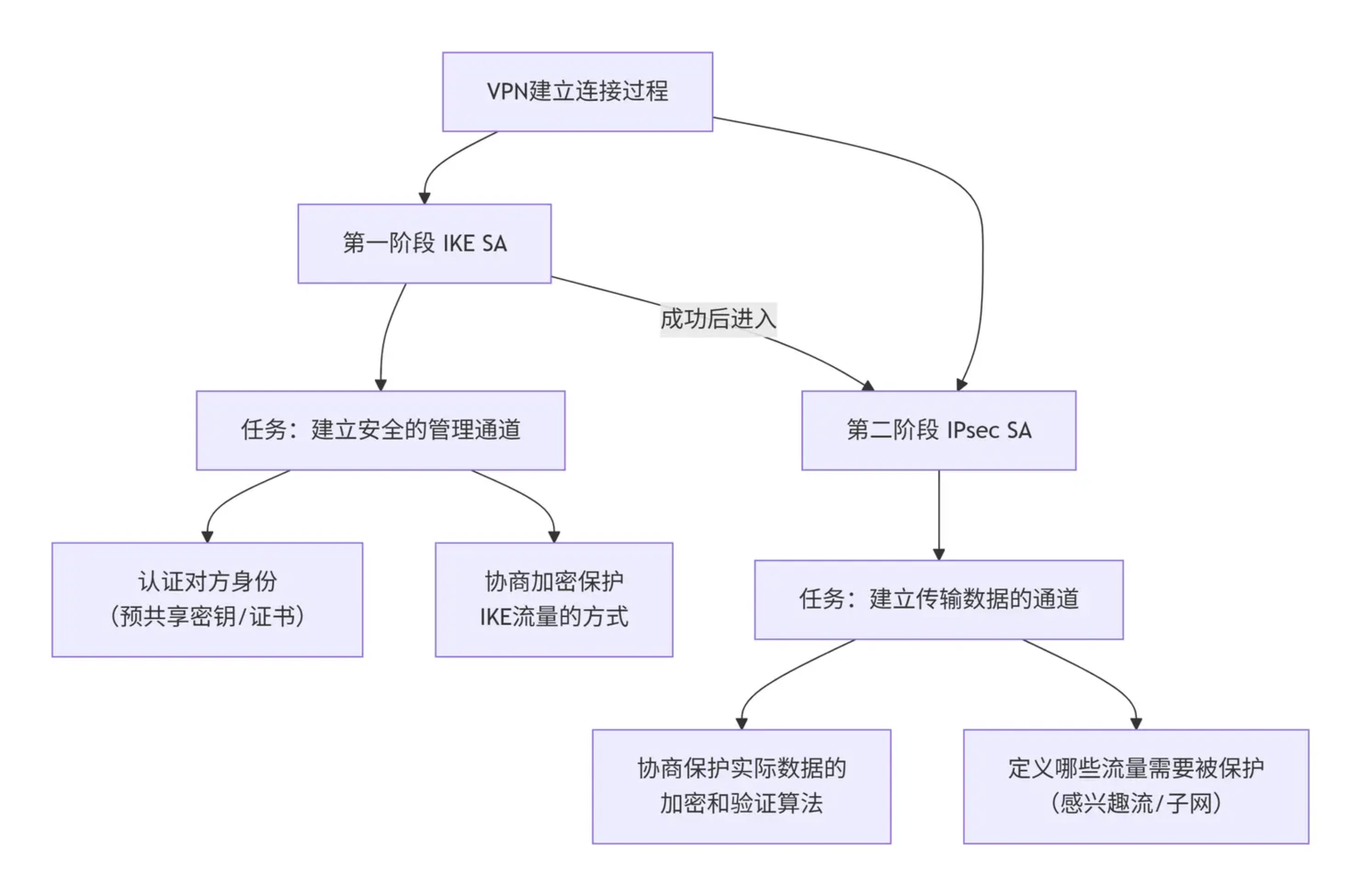 第二阶段 | 建立数据通道,定义如何保护数据 | 1. 感兴趣流(子网) 是否镜像配置 2. IPsec策略(加密/认证/PFS) 3. 路由设置 |
