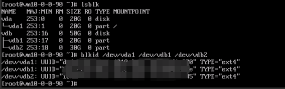 blkid /dev/vda1 /dev/vdb1 /dev/vdb2输出如下图所示