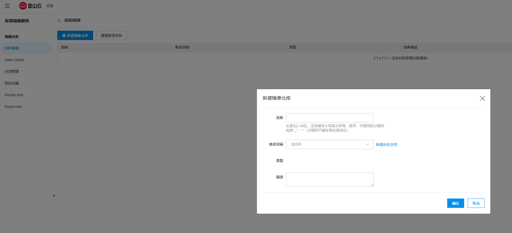 登录金山云容器镜像服务控制台,点击进入个人版实例>我的镜像>新建镜像仓库。
