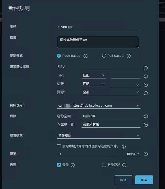 复制模式 | 选择 “Push-based”(推模式),把资源由本地Harbor推送到远端仓库 |