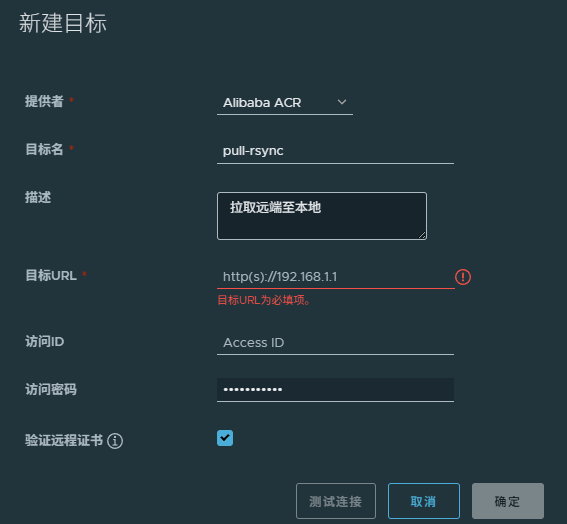 目标 URL | 填写 ACR 仓库地址(如阿里云 ACR 企业版地址https://registry.cn-hangzhou.aliyuncs.com) |