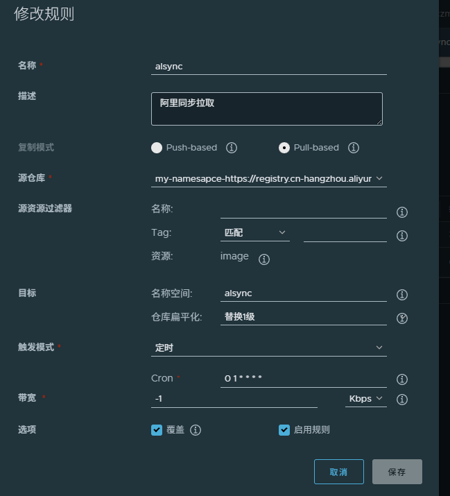 目标名称空间 | 在 Harbor 中新建专用名空间(如 “alsync”),用于存放从 ACR 拉取的镜像 |