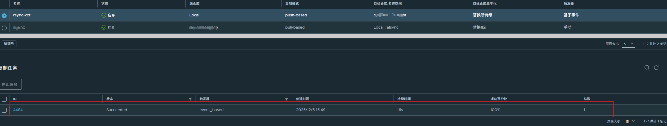 镜像推送至Harbor仓库后,基于事件触发(event_based)的复制规则将被触发并创建一个复制任务(Push_based)。
