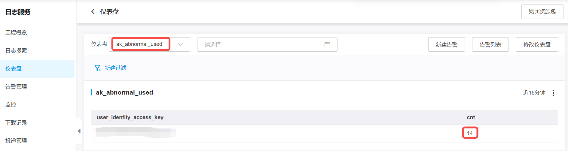 a.选中步骤四中创建的AccessKey异常使用的仪表盘和图表。