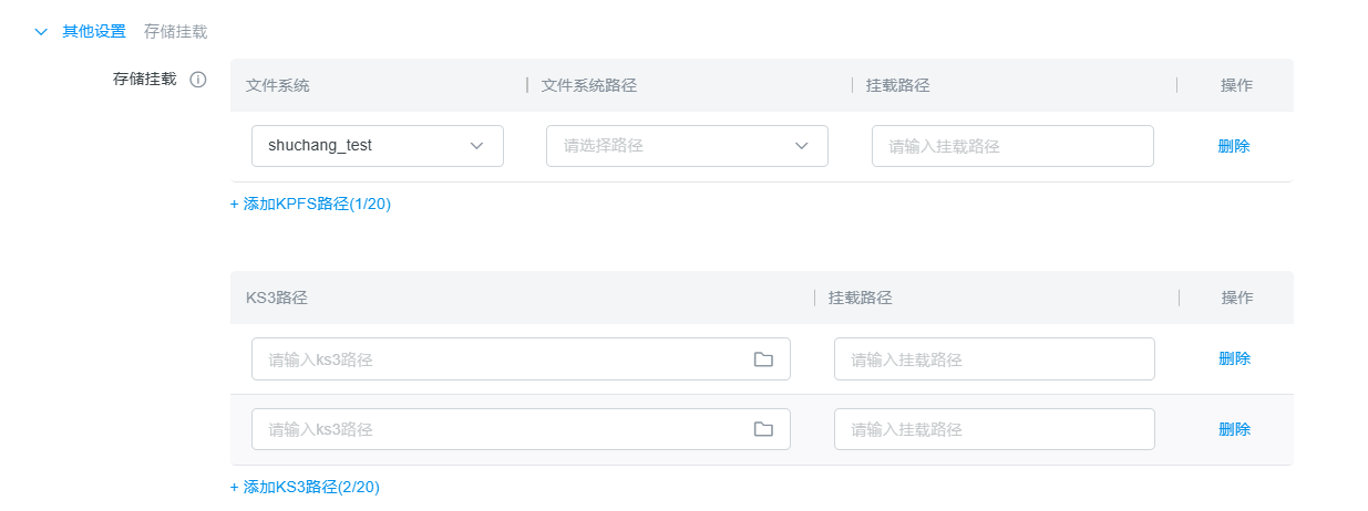 操作 | 管理挂载配置 | 点击"删除"移除该挂载配置,点击+添加KPFS路径,最多可添加20个KPFS挂载点 |