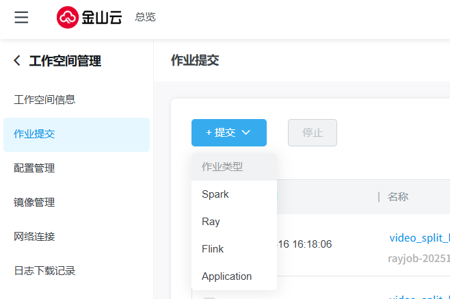 入口:点击 “提交” 按钮,在作业类型中选择 “Ray”,进入作业提交表单页面。