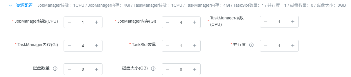 资源配置决定Flink集群的计算能力。所有数值可通过输入框右侧的"+"、"-"按钮调整。