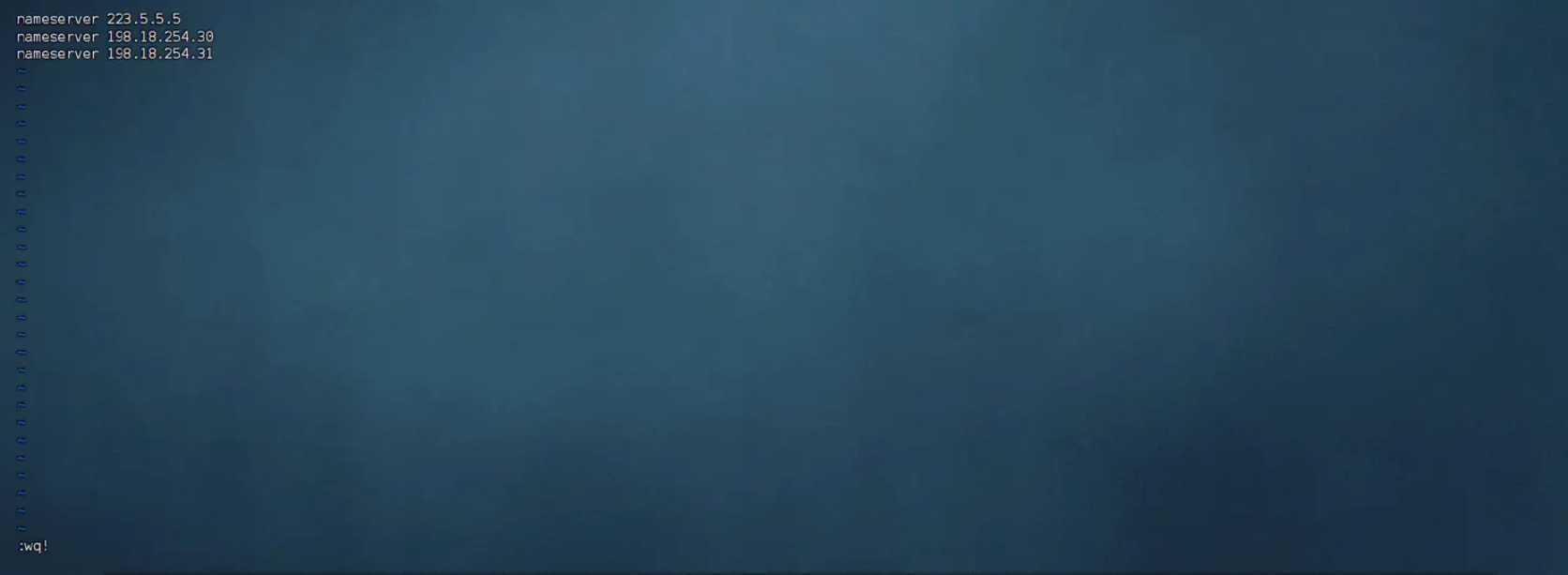 检查修改无误后先按ESC键,再同时按住Shift+:输入wq!后回车保存配置文件。