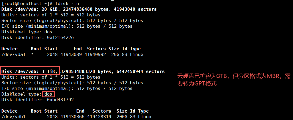 1 fdisk -lu若为dos,且扩容后容量超过2TB,需进行分区转换,否则无需转换,可直接扩展分区。