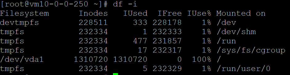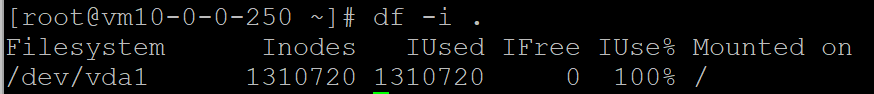 根分区 /dev/vda1的 inode 已耗尽:1310720 个 inode 中使用了 1310720 个,故推断出此为导致 "No space left on device" 的根本原因。