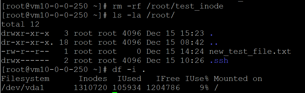 删除整个 test_inode 目录及其中的 120 多万个测试文件,然后观察inode的使用情况。