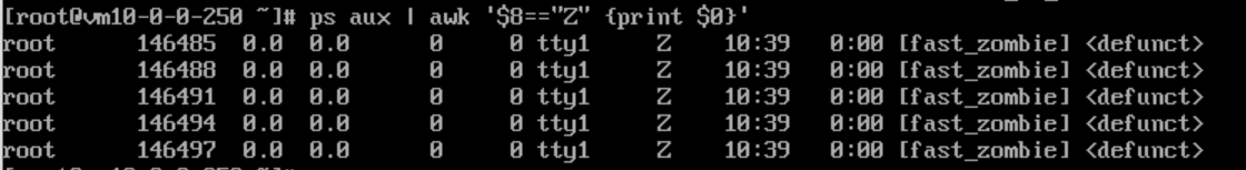 执行如下命令,观察发现,5个僵尸进程,都是由fast_zombie程序创建的。所有僵尸进程都处于Z状态(僵尸状态),由 root用户运行。