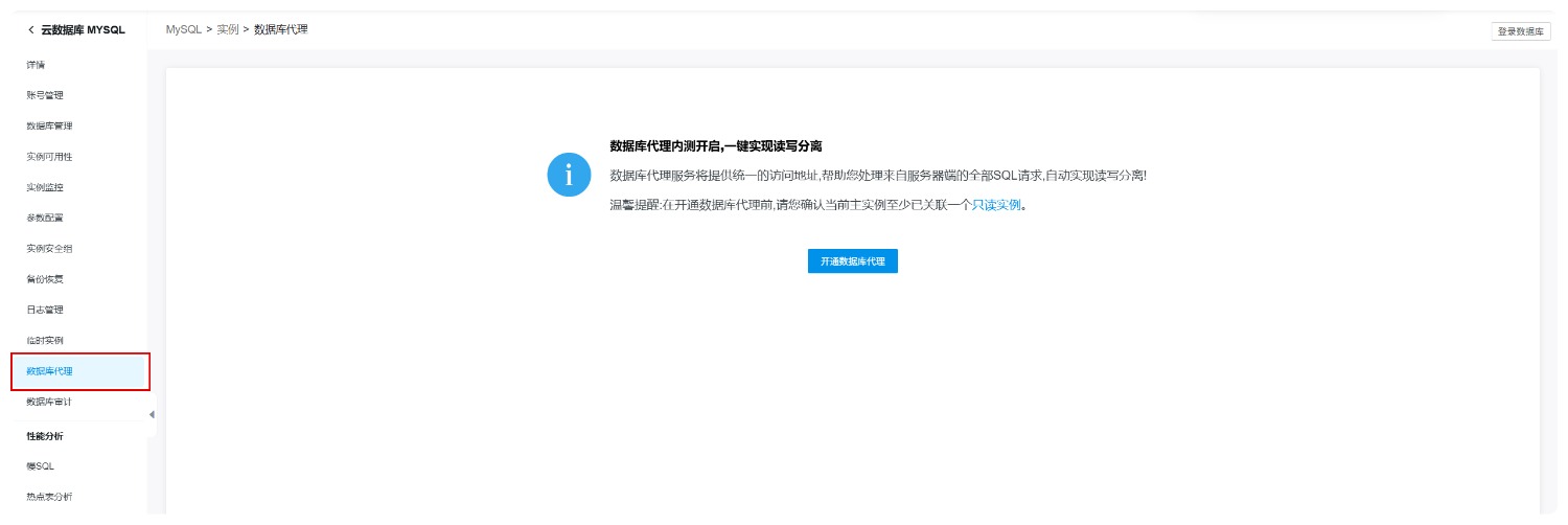 开通RDS MySQL实例后,可以开通使用数据库代理,可按照如下步骤操作: