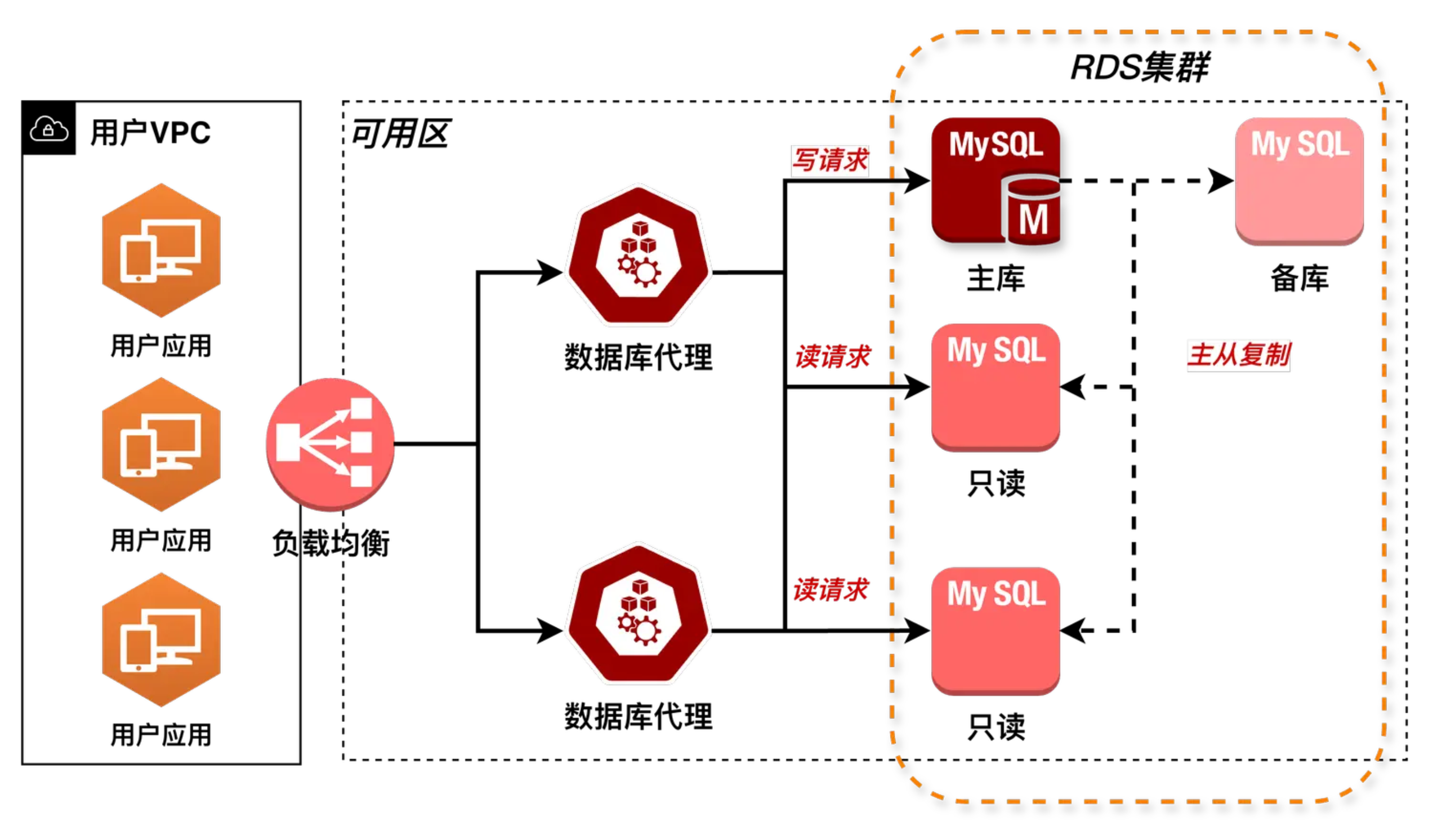 RDS数据库代理是部署在云数据库服务端与应用服务端之间的网络代理服务,统一承载应用对云数据库的访问请求。应用通过代理服务地址发起的所有请求,均由代理实例根据请求类型自动转发至主实例或只读实例,从而实现自动读写分离,有效降低主库负载,提升整体业务请求处理能力。