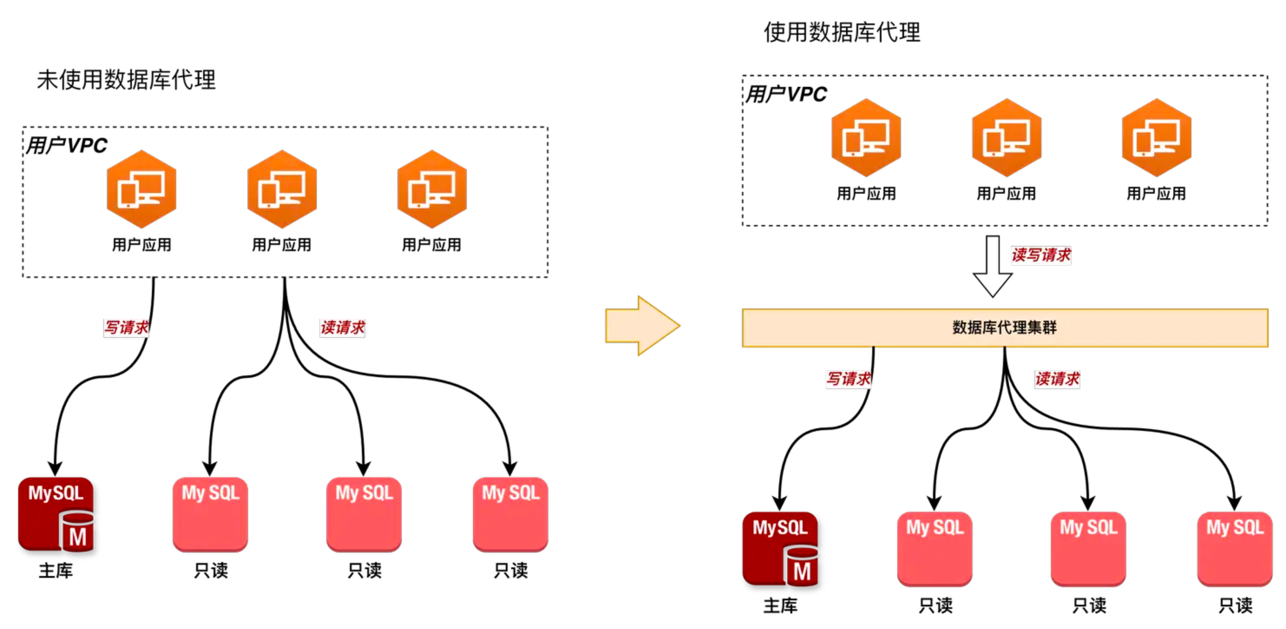 数据库代理在代理连接地址层面对请求进行解析和路由:写请求统一转发至主实例执行,读请求根据转发策略分配至各个只读实例,实现读写请求的自动分流,从而降低主实例负载并提升系统吞吐能力。
