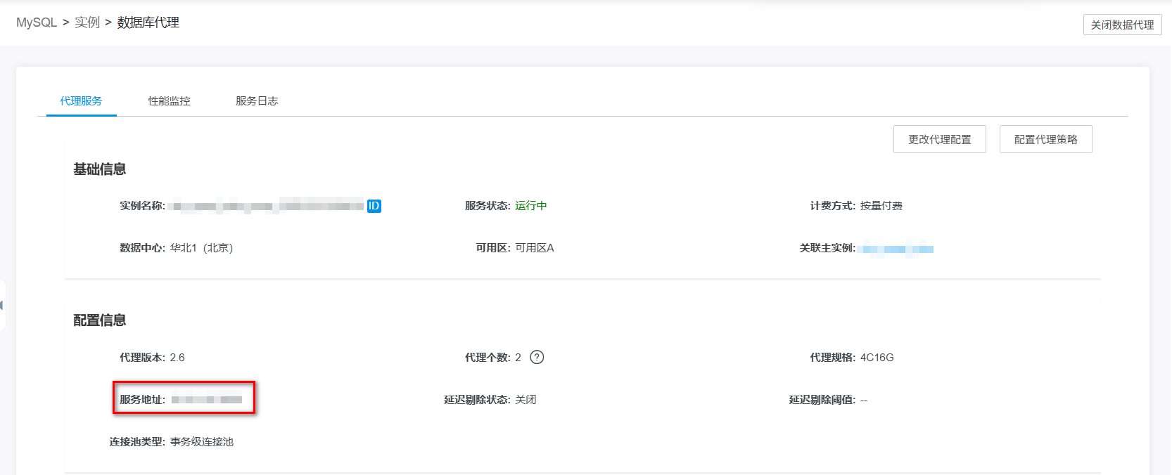 查看配置信息栏服务地址字段,即为数据库代理连接地址。
