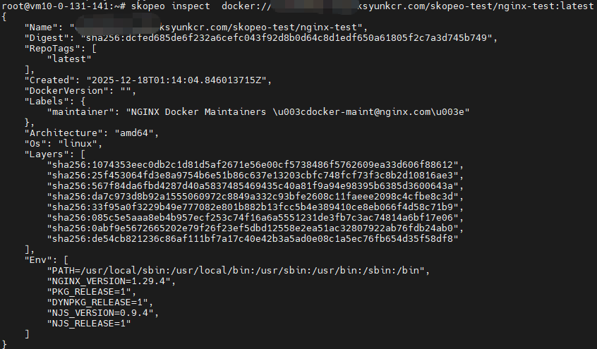 skopeo inspect --authfile ~/.docker/kcr-auth.json docker://xxxx.ksyunkcr.com/skopeo-test/nginx-test:latest纯净模式
