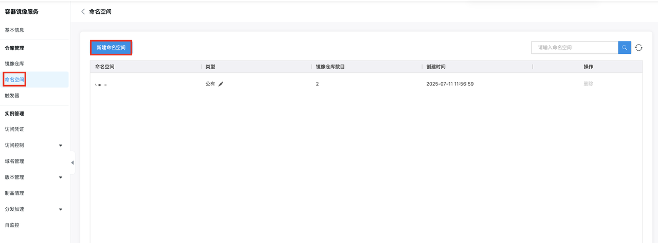 点击实例进入详情,创建命名空间