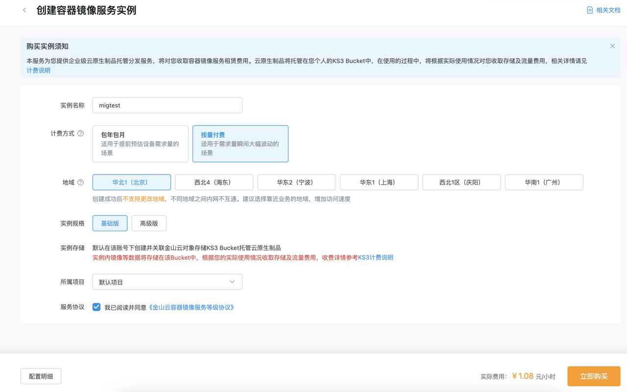 登录金山云控制台,创建镜像仓库(以企业基础版为例)以及命名空间。