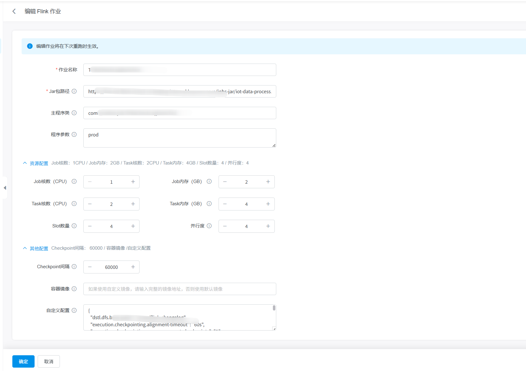 其他参数:Checkpoint间隔、初始化Savepoint路径、容器镜像、自定义配置(以JSON格式展示,支持滚动查看和复制)。
