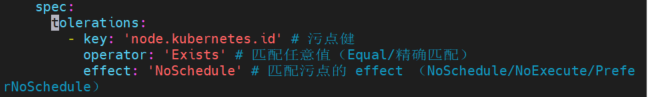 effect: "NoSchedule" # 匹配污点的 effect(NoSchedule/NoExecute/PreferNoSchedule)# 若无需调度到带污点的节点:移除节点的非必要污点(不推荐修改master节点)