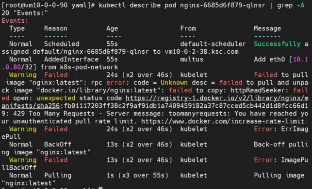 | 待调度 / 创建中 | Pod 已被 Kubernetes 接受,但容器尚未完全启动(可能是调度未完成、镜像拉取中、初始化容器未执行完) | 原因: 1. 节点资源不足(CPU / 内存不满足 2. 镜像拉取失败(镜像地址错误、私有镜像无拉取密钥、网络不通); 3. 调度策略限制(节点亲和性、Taints/Tolerations 不匹配); 4. 初始化容器(initContainer)执行失败;排查: |