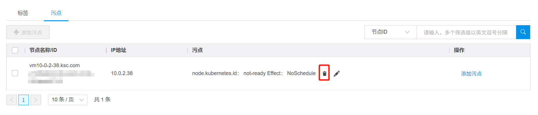 kubectl taint node <node-name> node.kubernetes.id=not-ready:NoSchedule- # 后缀 "-" 表示删除污点控制台移除污点操作如下图: